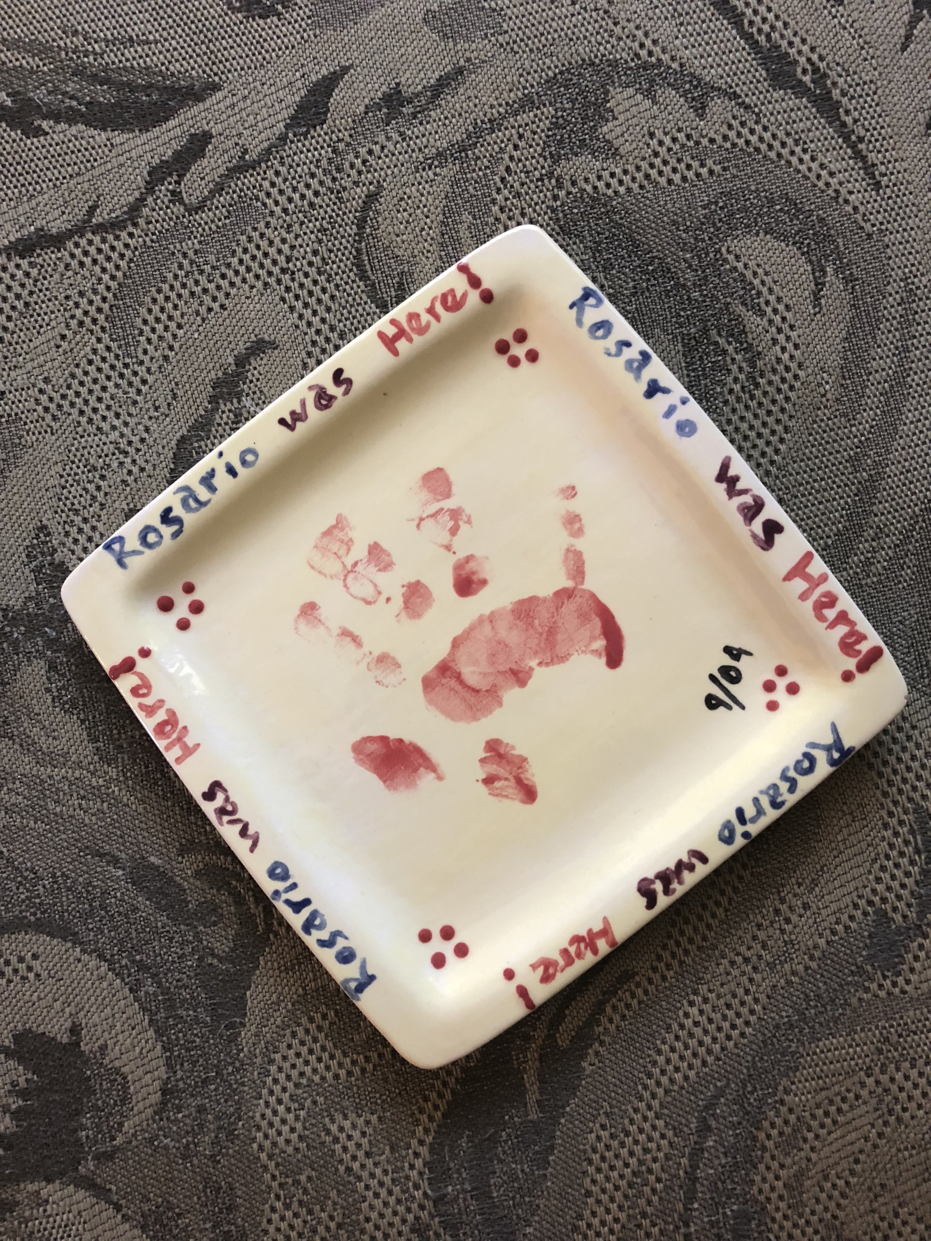 A ceramic yellow plate with Rosario's handprint (age2).