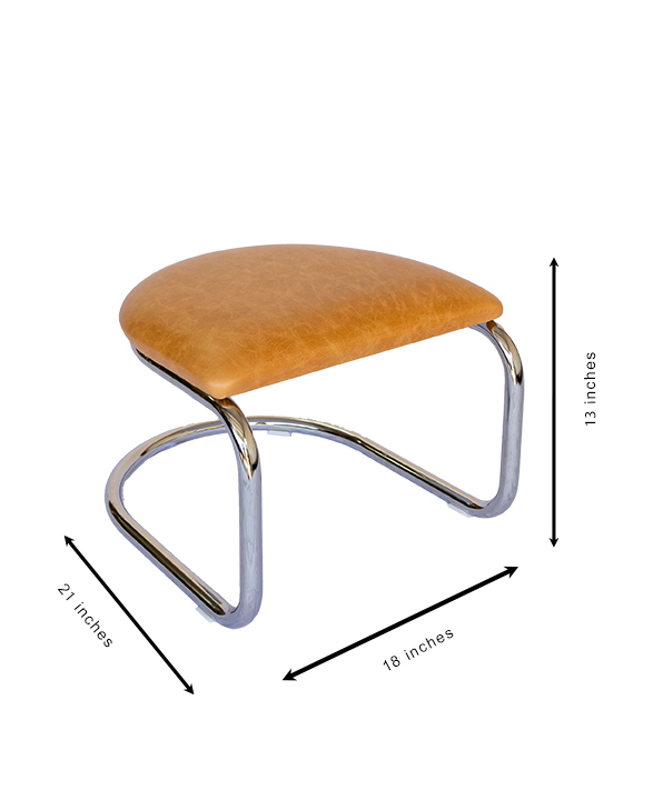 A new addition to the classic Lorren Chair, this ottoman lets you lean back and put your feet up. And when you don’t want to stretch out, the ottoman nests beautifully under your Lorren Chair. Built with the same heavy duty steel and durable genuine leather as the Lorren Chair, this ottoman is deigned to last a lifetime. Available in three leathers: Cafe’, Brown-Olive, or Light Honey: with two frame finish options: Chrome or natural steel.