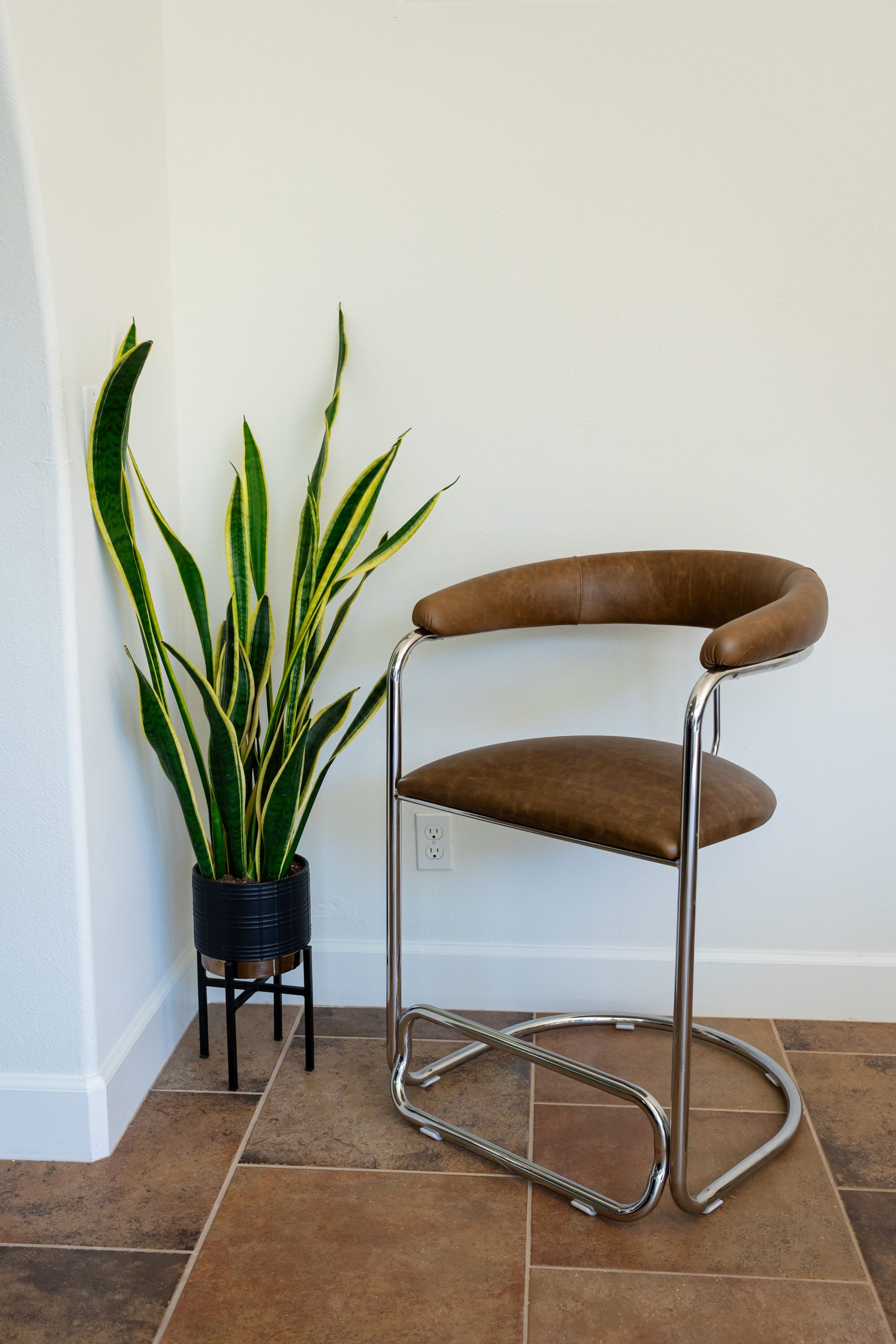 Taking style to new heights, the Lorren Stool elevates your seating options for your bar or island counter. Just as comfortable as the Lorren Chair, the curved back offers great support for your back and arms. The sturdy steel frame with built in footrest, takes up less floor space than similary sized tall stools. Available in three leathers: Cafe’, Brown-Olive, or Light Honey: with two frame finish options: chrome or natural steel.